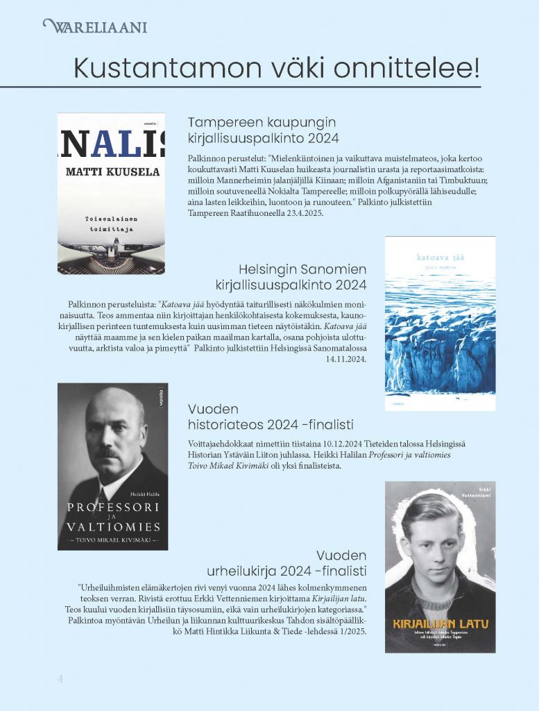 P.E. Svinhufvudin muistosäätiön hallitus on nimennyt ehdokkaat vuoden 2025 kirjapalkintonsa saajiksi. Ehdolla on kuusi teosta: Heikki Halilan ”Professori ja valtiomies” (Warelia), Alexander Stubbin ”Vallan kolmio” (Otava), Liisa-Maria Hakala-Zilliacuksen ”Presidentin tytär (Siltala), Helena Pilken ”Sanomalehtien sisällissota” (Vastapaino), Lasse Kankaan ”Sanan voimalla” (Verbatum) ja Sauli Niinistön ”Kaikki tiet turvaan” (WSOY).