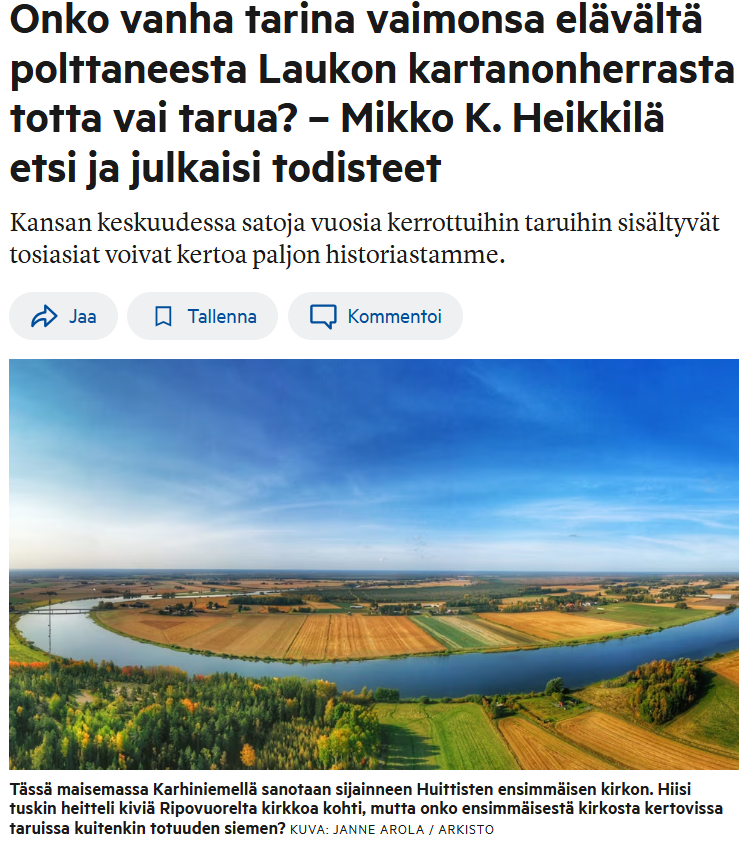 ”Mikko Heikkilä ei ole ensimmäinen, joka on Suomessa ymmärtänyt suullisen tarinaperinteen potentiaalisen historiallisen lähdearvon ja käyttänyt sitä lähdekriittisesti, mutta hän lienee nyt ensimmäinen, joka on näinkin monen esimerkkitapauksen analyysilla nostanut asian framille, ”ottanut härkää kiinni sarvista”! – – Teemaa taustoitetaan muualla maailmalla viime vuosikymmeninä lisääntyneellä kiinnostuksella suullisen historian tutkimukseen ja sen metodien kehittämiseen. Heikkilä käsittelee kirjassaan laajimmin Laukon kartanoon liittyvää Klaus-herran, Elinan ja Kirstin tulista kolmiodraamaa ja pystyy vahvistamaan suurella todennäköisyydellä paikkakunnalta tallennetun suullisen perinteen katolisen ajan viimeisen piispan Arvid Kurjen perheeseen 1470-luvulla: tuomari Klaus Kurkeen ja hänen toiseen puolisoonsa Elinaan.”